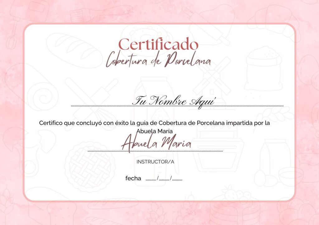 Al completar el curso, recibirás tu certificado con la merecida aprobación de competencia, listo para ser impreso y exhibido en tu repostería!